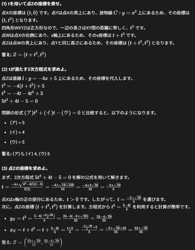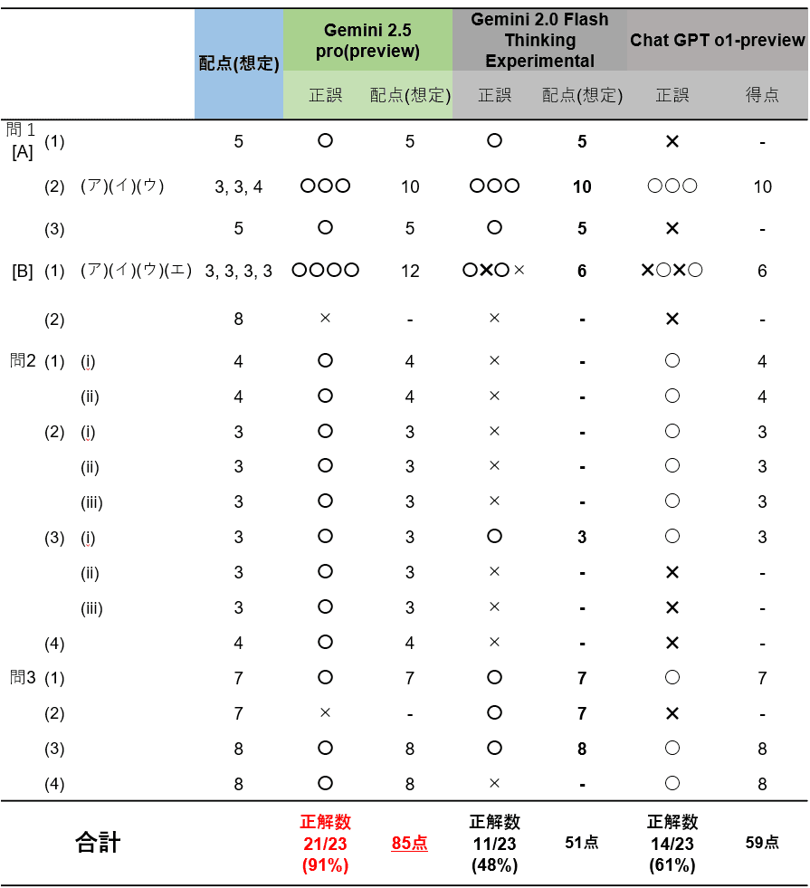 今回は、Gemini 2.5proに問題を解かせてみましたが、結果はなんと100点満点中85点と高得点となりました。これまでの、Gemini 2.0やOpen AI o1-previewでは50点台でしたので、ジャンプアップしています。