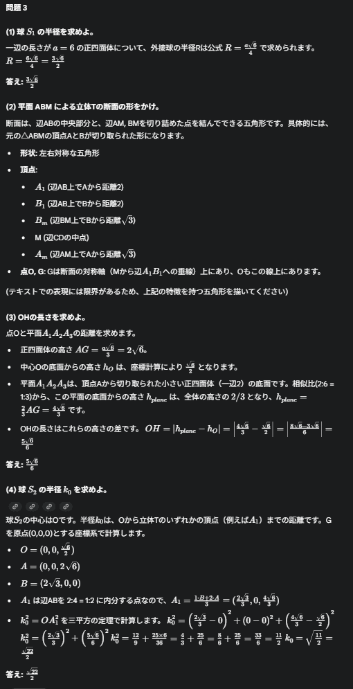 大問3は惜しくも(2)だけ間違えでした。(2)は、断面図を図示する問題でGeminiが文章でしか現状出力できずなので若しかしたらGeminiの中ではわかっているのかもしれませんが、説明では合っているかわからなかったので間違えとしてます。