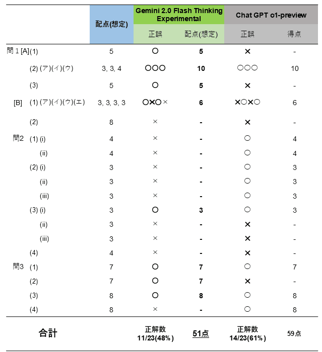 今回は、Geminiに問題を解かせてみましたが、結果は100点満点中51点となりました。o1-previewとは問題の入力の仕方が違うので、Apple to Appleの比較ではありませんが、o1-previewに届かずの結果になりました。
