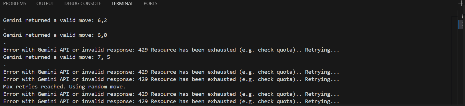 エラーが起きたときは、もう一度Geminiに再考させた上でそれでもエラーがだた場合はランダムな手を打つようにプログラムしており、↓のように頻繁にエラー/ランダム手を打つようになってしまいました。