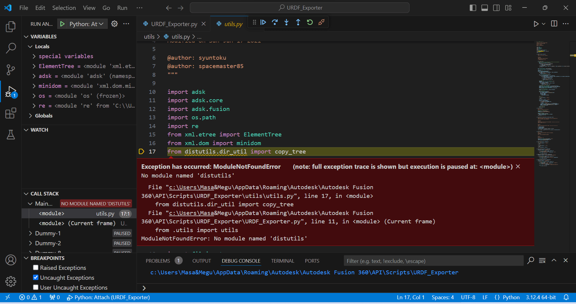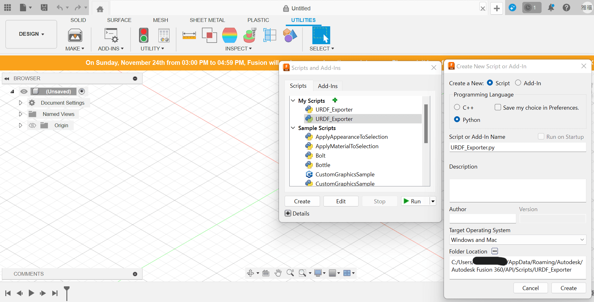 ・Script or Add-In Name : URDF_Exporter.py(走らせるプログラムファイル名)