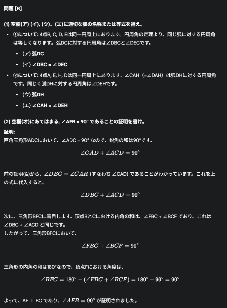 大問3は惜しくも(2)だけ間違えでした。(2)は、断面図を図示する問題でGeminiが文章でしか現状出力できずなので若しかしたらGeminiの中ではわかっているのかもしれませんが、説明では合っているかわからなかったので間違えとしてます。